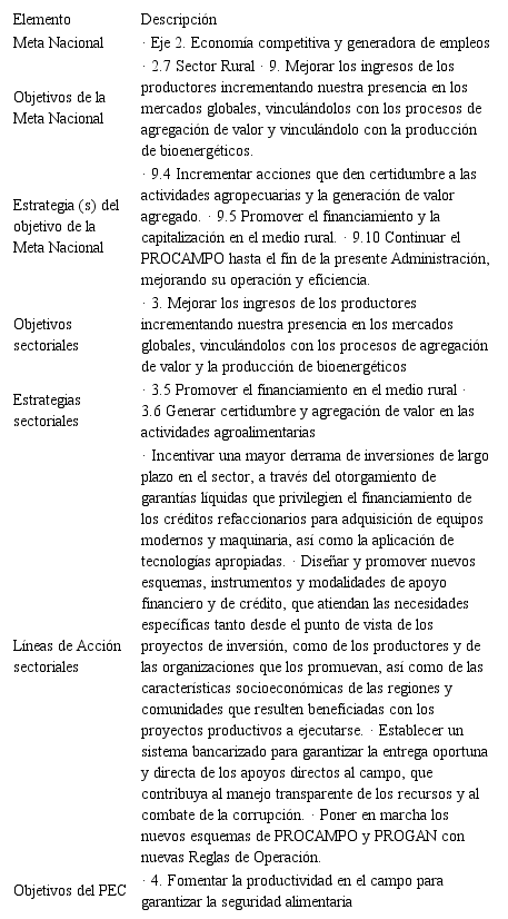 El PEC 2014–2018, “comprende las políticas públicas orientadas a la generación y diversificación de empleo y a garantizar a la población campesina el bienestar y su participación e incorporación al desarrollo nacional, …” (DOF, 2014) (Cuadro 1)