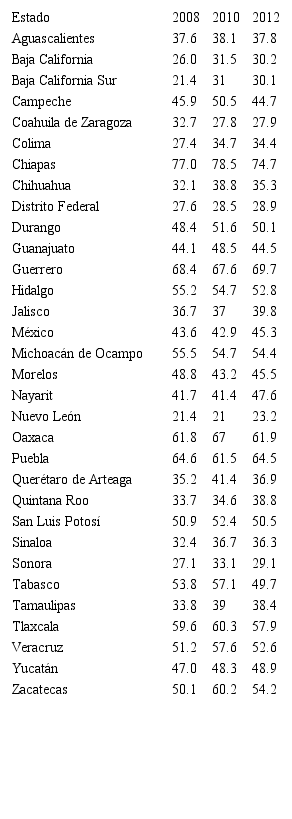 Sin embargo, el beneficio del incremento en el PIB se distribuye de manera diferente en cada entidad del país, por lo que a nivel país se tiene un beneficio general pero en nivel estatal cada entidad federativa presenta una situación diferente, considerando el porcentaje de población de pobreza que generan más riqueza menor, siendo en el 2008 las entidades Nuevo León con 21.4, Baja California Sur con 21.4 y Baja California con 26; en el 2010 Nuevo León con 21, Coahuila de Zaragoza con 27.8 y Distrito Federal con 28.5; en el 2012 Nuevo León con 23.3, Coahuila de Zaragoza con 27.9 y Distrito Federal con 28.9 (Tabla 2).