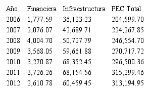 La tendencia de la vertiente de infraestructura en el PEC ha sido creciente, con incrementos anuales; ha tenido algunas bajas, pero siempre representa una importante proporción de los recursos del PEC, con 34.94% en 2012 contra 39.38 en 2011. La vertiente financiera se redujo, representando el 1.51% en 2012 (figura 3).