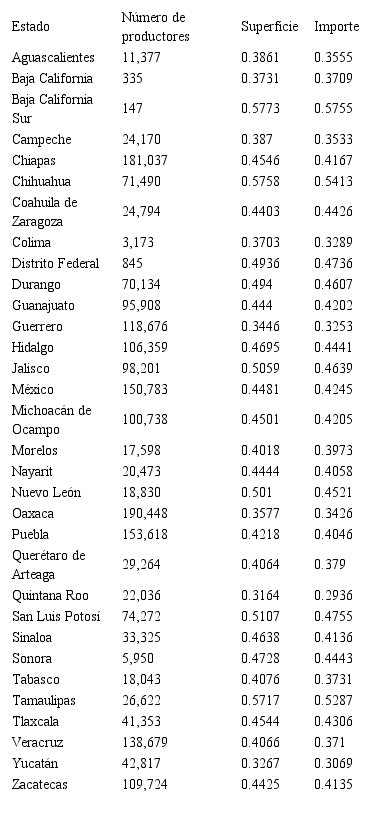 Cuando se considera el Índice de Gini con respecto la distribución de recursos monetarios de PROCAMPO los estados con menor desigualdad son Quintana Roo con 0.2936, Yucatán con 0.3069, Guerrero con 0.3253, Colima con 0.3289, Oaxaca con 0.3426 y Campeche con 0.3533. Los estados con mayor desigualdad son Baja California Sur con 0.5755, Chihuahua con 0.5413, Tamaulipas con 0.5287, San Luis Potosí con 0.4755 y Distrito Federal con 0.4736 (Tabla 4).