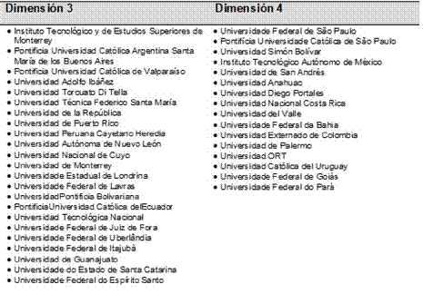 Finalmente, la Tabla 10 muestra las universidades clasificadas según las dimensiones en las cuales son fuertes. En ella se destaca que el mayor número de universidades se caracterizan por ser fuertes en la dimensión 1, donde el factor Impacto en la Web es el más relevante, con 42 universidades. En esta dimensión incluye a nueve de las diez mejores posiciones en QS-AL. Por otro lado, la dimensión 4 es la que menor número de universidades agrupa es la 4, las que se caracterizan por el número de docentes por estudiante, con 16 universidades.