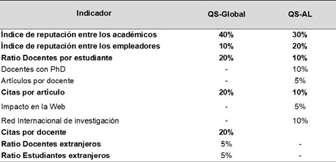 Los indicadores aplicados en ambos rankings siguen intentando evaluar a las universidades en los ámbitos de la docencia, investigación, transferencia de conocimiento y perspectiva internacional. Pero la metodología o ponderaciones aplicadas difieren a las versiones globales. Aun así, los resultados encontrados por ambos rankings no difieren de manera importante. De las 50 universidades clasificadas por THE-AL en el año 2016, 44 están presentes en ambos rankings. Universidades como las de Sao Paulo, Estadual de Campinas, de Chile, Autónoma de México, por mencionar algunas, están clasificadas en las primeras posiciones de ambos rankings. La explicación es que existe una alta correlación en los resultados de ellos, especialmente entre aquellos clasificados en las primeras posiciones de los rankings.