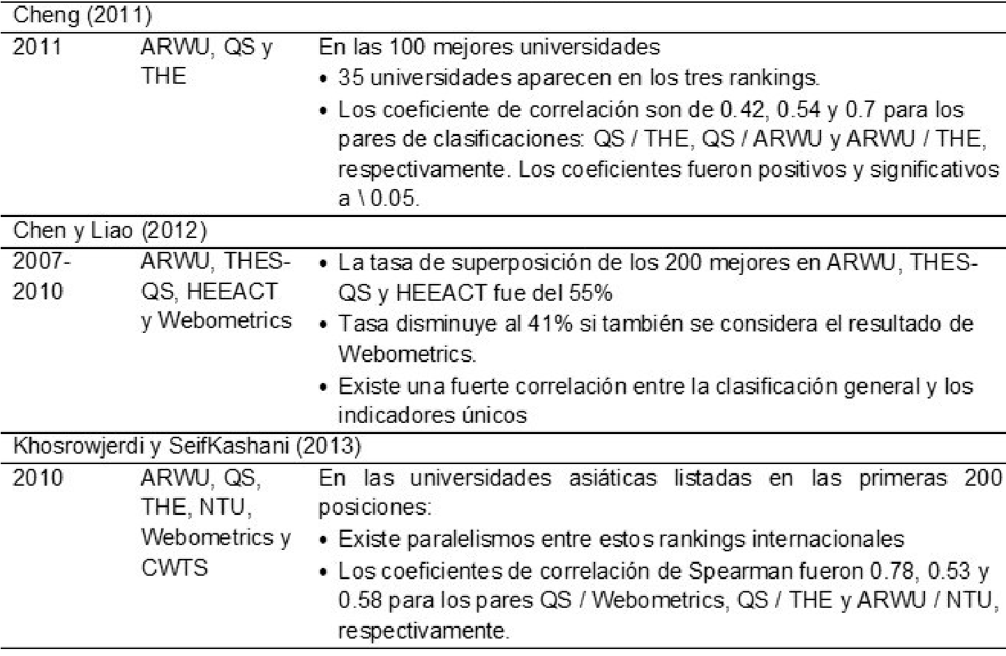 A partir de los rankings universitarios que clasifican universidades a nivel global se han generado diversas investigaciones que comparan las metodologías y resultados obtenidos por ellos. Algunas de las investigaciones se han centrado en determinar si, a pesar de las diferencias en las metodologías aplicadas en los rankings logran llegar a resultados similares. Shehatta & Mahmood (2016) entrega algunos de los resultados encontrados (Tabla 4).