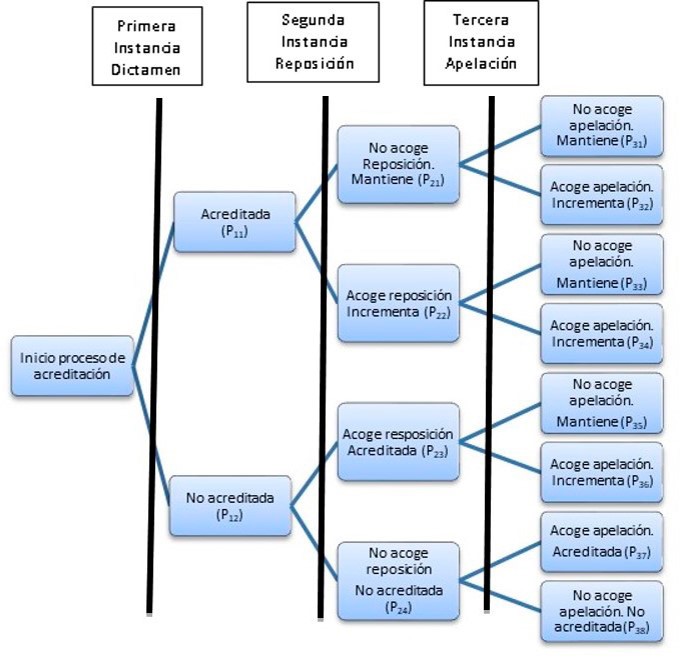 Basado en esta notación de probabilidades existentes en cada instancia de acreditación, se tiene: