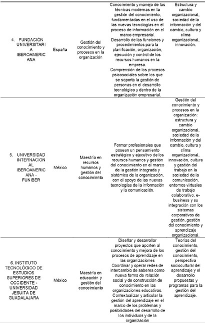 Otra aclaración que habría que hacer es el caso de la Fundación Universitaria Iberoamericana (FUNIBER), cuyo Programa incluye, además del enfoque de la gerencia del conocimiento ligado a lo empresarial, el componente psicosocial que articula y organiza como un proceso con importantes implicaciones no solo tecnológicas, organizacionales, sino también psicológicas y cognitivas. La Universidad Autónoma de Barcelona, enfoca los principios y criterios de la gerencia del conocimiento hacia el ámbito de las instituciones de la salud, lo cual constituye un elemento por destacar, debido a que la mayor parte de los programas revisados mantienen el enfoque de la gerencia del conocimiento hacia el ámbito empresarial y de las entidades de la administración pública.