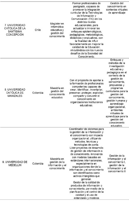 Por otro lado, en relación a los contenidos presentes en las mallas curriculares, la comparación de este grupo de maestrías analizado evidenció que la media de estas, tiene como mínimo un módulo temático directamente relacionado con contenidos en gestión del conocimiento. Es importante mencionar, que algunas de estas universidades amplían esta temática un poco más a lo largo de sus estudios, pero eso depende de los intereses formativos de cada institución.