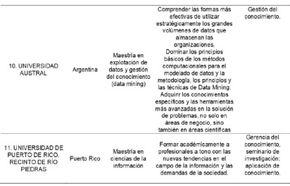 Igualmente, es importante destacar que la maestría de la Universidad de Medellín tiene un alto componente informático y es la única del conjunto analizado que está destinada únicamente para profesionales en el área de ingenierías. En el caso de la Universidad Austral, su maestría se caracteriza por la influencia marcada en los principios y las técnicas de Data Mining el cual se ve reflejado en su número de materias relacionadas directamente con Data Mining, Web Mining y Text Mining. Por su parte, la Universidad de Río Piedras se destaca por tener un enfoque en Bibliotecología y Ciencia de la Información, similar a la Universidad del Zulia de Venezuela.