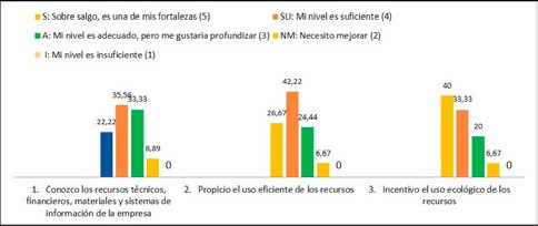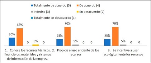 Sobre este mismo indicador se consultó a los estudiantes y sus respuestas se agruparon en el gráfico 2. Se observa que en los tres (3) reactivos la tendencia predominante es la positiva, es decir, que los estudiantes demostraron tener el conocimiento, además del uso eficiente de los recursos, lo cual corresponde con Hintze (1999:67) en que “las organizaciones son los ámbitos en que los recursos se transforman en resultados, pueden ser descritas como modos de organizar el uso de recursos. Estos recursos -humanos y materiales- que cuestan dinero e incluyen tecnologías”.