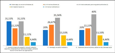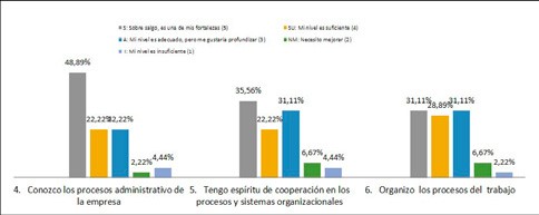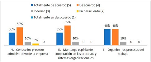 En estos tres (3) reactivos se demuestra que, según los gerentes, el Licenciado en Administración debe conocer los procesos administrativos, trabajar en la cooperación de los mismo y organizar los procesos de trabajo; concertando con Zaratiegui (1999:8288), quien destaca que “los procesos constituyen para muchas empresas la base de su gestión estratégica” y para estos gerentes, la administración de estructuras y procesos es un elemento de importancia para que sea manejado por los Licenciados. Hay que tomar en cuenta que al tener estructuras y procesos bien definidos, se cuenta con una competencia organizacional que garantizará el éxito en el mediano y largo plazo en función de la adaptación a los cambios de entorno y de mercado.