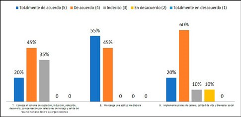 Se observa que los estudiantes concuerdan con los gerentes al mostrar que su conocimiento acerca de los procesos de recursos humanos no se encuentra del todo consolidado, aspecto que debe ser superado, pues según Barquero (2005) es importante el buen trato por parte de las organizaciones con los empleados, ya que ello contribuye en su realización como ser humano y, por ende, a la consecución de los objetivos propuestos por la empresa. Debilidades como estas conducen a que los estudiantes a solicitar al docente la implementación de estrategias que les permita formarse como profesionales completos e idóneos y el desarrollo de una gestión curricular coordinando acciones académicas con y los requerimientos de la sociedad.