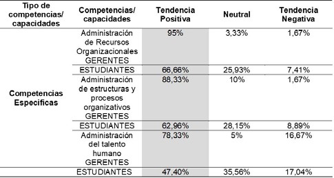 En relación con las competencias específicas, se observa alta tendencia positiva para el indicador administración de recursos organizacionales (95%), el cual contrasta con la perspectiva de los estudiantes quienes se expresaron también de forma positiva en un 66,66%. Sin embargo, es importante observar los valores a tomar en cuenta en las tendencias neutrales y negativas, detectando en los estudiantes un nivel adecuado con 25,93%, como el caso de los indicadores administración de estructuras y procesos organizativos que, aunque para ambos (estudiantes y gerentes), presenta una alta tendencia positiva, los gerentes piensan de forma neutral en un 10% mientras que los estudiantes poseen esa misma opinión neutral en un 28,15%.