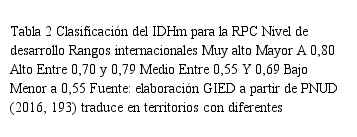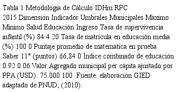 El cálculo del IDHm municipal conlleva ajustes en el uso de la información debido a la disponibilidad restringida de datos desagregados a nivel subnacional. Para el caso particular de la medición del IDHm para los municipios de la RPC, y teniendo en cuenta las tres dimensiones que propone el PNUD se relacionan los indicadores utilizados para el cálculo y los umbrales definidos para la clasificación de los grupos, tabla 1.