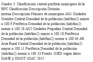 El análisis de centralidad y distancia requiere de una reagrupación complementaria a la anterior (Cuadro 3); vale anotar que por efectos de la geografía del territorio y por la disponibilidad de información, la variable distancia no se utiliza; se utiliza como proxi la densidad de población por kilómetro cuadrado, siguiendo la metodología de Polèse et al, (2007:157-180).
