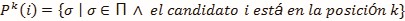 Se denota con al subconjunto de que representa a todos los órdenes que listan al candidato en la posición. Luego entonces en este caso todos los votantes