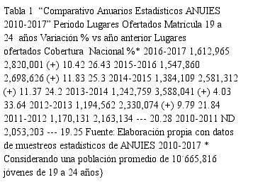 Estos resultados coinciden con cifras publicadas por la Secretaría de Educación Pública (SEP) que indican su porcentaje de cobertura educativa a nivel superior para jóvenes de entre 18 y 23 años durante el ciclo 2015-2016 fue de 31.2%, 2016-2017 con 32.1% y 20172018 con 33.1% (SEP, 2017).