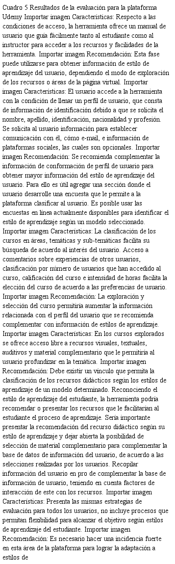 A continuación, en el cuadro 5 (a manera de ejemplo) se presentan los resultados de la evaluación de una de las plataformas virtuales de educación seleccionada (Udemy), mediante la metodología descrita anteriormente, se analiza la información encontrada se ofrecen las recomendaciones generadas para la inclusión de estilo de aprendizaje. Otras plataformas analizadas y cuya información no se presenta en este artículo por temas de espacio son: Coursera, Gift-Portal.