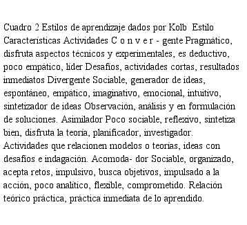 Los estilos de aprendizaje según el modelo Kolb se clasifican en cuatro áreas, de acuerdo a los procesos experimentales y clasificación del conocimiento, así (Sudria et al, 2018:97): Convergente: estilo de aprendizaje relacionado con personas que tienen preferencias por los aspectos teóricos y los procesos experimentales activos. Asimilador: las personas de este campo prefieren el aprendizaje basado en el componente de conocimiento teórico con experimentación reflexiva. Acomodador: estilo se aprendizaje relacionado con personas que tienen preferencia por el conocimiento práctico y por la experimentación activa y Divergente es el estilo asignado a personas que tienen preferencia por el aprendizaje experimental reflexivo combinada con el de conocimiento pragmático. En la figura 2 se presenta un resumen.