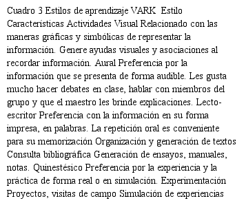 cuadro 3 se expresan las principales características de la clasificación de los estilos de aprendizaje bajo este modelo y las actividades que favorecen el aprendizaje de las personas clasificadas en estas áreas (Peter et al, 2010: 95), cuadro 3.