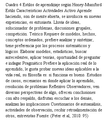 Desde este modelo, el proceso de aprendizaje incluye la continuidad de las fases: experiencia, revisión de experiencia, conclusión desde la experiencia y planeación (Peter et al, 2010: 93). En la primera fase el individuo tiene una experiencia acerca del objeto de aprendizaje, en segunda instancia se tiene una reflexión y se dan las condiciones para el análisis de la experiencia, posteriormente se elaboran conclusiones y finalmente el aprendiz planea el siguiente paso, retoma otra experiencia y vuelve a repetirse el ciclo. En el cuadro 4, se presentan las características principales de los estilos de aprendizaje definidos por Honey y Mumford y las actividades que se recomiendan dentro del proceso de aprendizaje.