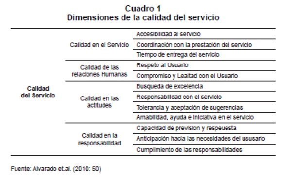 Alvarado Peña., Lisandro José.; Izaguirre Diaz, Fridzia (2015), Calidad del servicio en universidades públicas mexicanas: perspectivas de análisis desde las dimensiones. En Revista Pensamiento y Gestión. Universidad del Norte, 95-118, 2015.