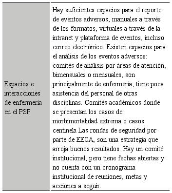 El equipo líder interactúa ante los eventos adversos pero no hay interacción con otros equipos, no se evidencia la presencia del comité institucional de eventos adversos, las reuniones del equipo o de las enfermeras en los servicios no tienen impacto a nivel institucional, no se moldea la gobernanza en torno a la reducción de la inseguridad y promoción del intercambio de información. E2: “No existen espacios de interacción a nivel institucional donde se congregue a toda la comunidad a informar sobre los avances, dificultades o motivaciones que impulse la información de donde estamos y a dónde vamos”.