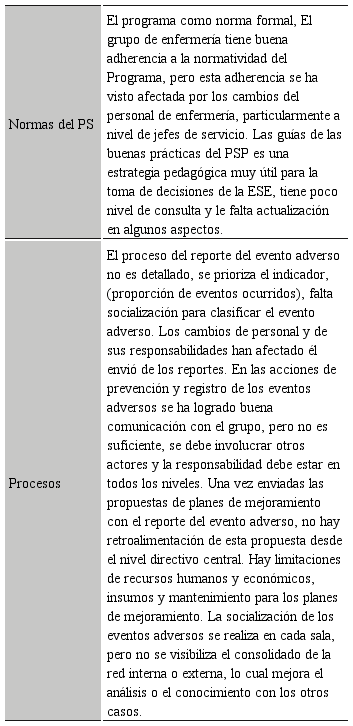 El proceso más importante para la toma de decisiones respecto a la atención segura, es el reporte de los eventos adversos y la implementación de los planes de mejoramiento. El principal proceso del programa que leva a acabo el grupo líder, se refiere al reporte de los eventos adversos, E.9 explica, “Los reportamos trimestral, semestral y al año, nos reunimos y revisamos siempre con el medico de seguridad del paciente del servicio, invitamos una enfermera y yo, algunas veces la médica jefe del servicio, además los socializamos y publicamos el informe en cada sala, y por sala hacemos los indicadores cuál fue el evento que más se presentó, los indicadores se envían a nivel central, pero nunca hay retroalimentación desde la dirección”. E3 “la poca cultura de hacer una actividad que es de todos, recae solo en enfermería, que si bien ha logrado resultados como una comunicación más abierta, no resulta ser suficiente para la continuidad del proceso de manera continua, coherente y con inversión y responsabilidad en todos los niveles y por todos los actores”.