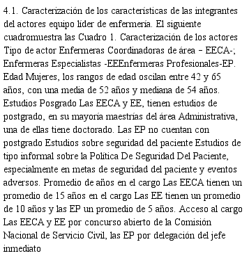 Se diseñó un estudio cualitativo de tipo exploratorio e interpretativo, a partir de entrevistas semiestructuradas a un grupo de enfermería comprometido en el liderazgo del Programa de Seguridad del paciente, en una Empresa Social del Estado. El grupo estuvo compuesto por:1) Enfermeras coordinadoras de área (EECA) quienes direccionan las estrategias de seguridad del paciente en los servicios de hospitalización asignados. 2) Enfermeras especialistas con funciones precisas frente a la meta de seguridad del paciente (EE); y 3) Enfermeras profesionales (EP) que responden a las funciones de asistencia directa y del programa de seguridad en salas de hospitalización. Se realizaron 9 entrevistas.
