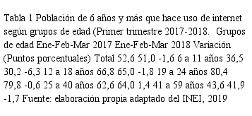 Reforzando la información anterior se tienen los datos suministrados por la Tabla 1, la población joven y adolescente del Perú es la que más tuvo acceso a uso de internet (79,8% y 65,0% respectivamente) durante el primer trimestre de los años 2017-2018; mientras que la población de 60 y más años de edad solo emplea internet el 16,2%, hecho que refuerza el hecho de exclusión de este grupo etario.