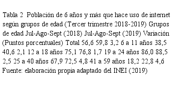 Ahora bien, si se comparan dichas cifras con lo sucedido meses después durante el tercer trimestre de los años 2018-2019, se tiene que la variación porcentual ha sido significativa (aumento de 3,2 puntos porcentuales), tal como se puede observar en los datos de la Tabla 2 para el periodo 2018-2019, de donde se recoge que en el caso peruano ha ocurrido un crecimiento significativo en los grupos etarios respecto a su acceso a internet. Este aspecto pudo haberse dado, entre otras cosas a la accesibilidad por rebaja de costos en la oferta del mercado peruano y la introducción de nuevos competidores en la promoción del servicio, lo cual revirtió en el incremento positivo. También se recoge el hecho del crecimiento comparativo ocurrido entre 2017 a 2019 de las poblaciones jóvenes y adolescentes frente a su acceso a internet, situación que refrenda un mayor acceso y empleo de tal recurso.