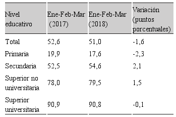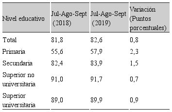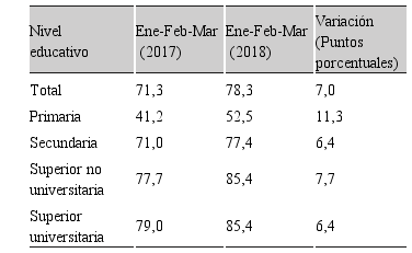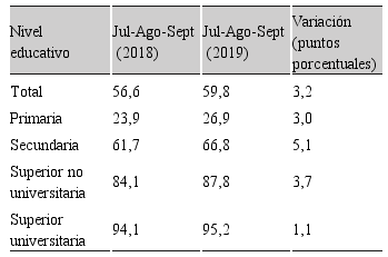 Según lo manifestado por Galperin (2017), la educación es un fuerte predictor del empleo de internet. Como muestra el Gráfico 5, se puede constatar que, en el caso peruano, existe un incremento más rápido del empleo de internet conforme el individuo tenga mayor nivel educativo. Dicho aspecto es reforzado por los datos consignados en la Tabla 3, donde la población peruana con nivel educativo superior universitaria y no universitaria fue la que tuvo un mayor acceso a internet (90,8% y 79,5% respectivamente); seguidos de la población con educación secundaria 54,6% y la población con primaria o menor nivel, 17,6% al comparar los primeros trimestres de los años 20172018. Dicha vertiente se mantiene al alza respecto a la población del tercer trimestre de los años 2018-2019, con educación superior universitaria y no universitaria (95,2% y 87,8%, respectivamente) quienes en mayor proporción accedieron a los servicios de Internet. Ello traduce un significativo incremento de 4,4 puntos porcentuales para la población universitaria y 8,3 para la población no universitaria, cuando son comparados dichos datos de las Tablas 3 y 4. Dicho aspecto evidencia una reducción de la brecha de acceso de las poblaciones que requieren de tal servicio.