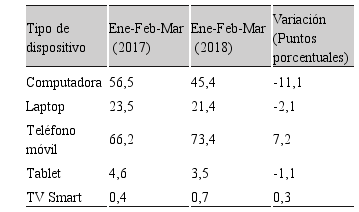 Según lo manifestado por Quispe (2018) el desarrollo y expansionismo continuo de la SI es posible de ser determinada por una revisión paulatina de los indicadores afines a las TICs. Uno de tales indicadores y, quizás el más relevante, es el acceso a internet facilitado por el empleo de algún tipo de dispositivo, de lo cual el INEI (2018) según los datos consignados en la Tabla 5 reconoce que, en el primer trimestre del 2018, el 73,4% de la población peruana accedió a internet por medio de su teléfono móvil o Smartphone.