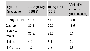 INEI. (2019). Estadísticas de las Tecnologías de Información y Comunicación en los Hogares (Informe técnico 2019). Lima: INEI. Recuperado de https://www.inei.gob. pe/media/MenuRecursivo/boletines/ ticdiciembre.pdf