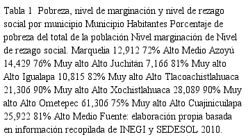 Cuajinicuilapa, Tlacoachistlahuaca, Ometepec y Xochistlahuaca) arrojó que más del cincuenta por ciento de los sitios seleccionados se encuentran en pobreza y muy alto índice de marginación como se aprecia en la tabla 1.
