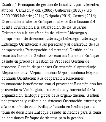 Se señalan en el Cuadro 1 se señalan tales principios desde la perspectiva de diferentes autores (Camisón et al, 2006; Gutiérrez, 2010; Lizarzaburu, 2016); Hernández, Martínez y Rodríguez, 2017; Gutiérrez, 2005; Madriz, 2014; Delgado, 2015; Castro, 2016); entre otros que apoyados en la norma ISO 9001:2015, precisan elementos de interés como sigue:
