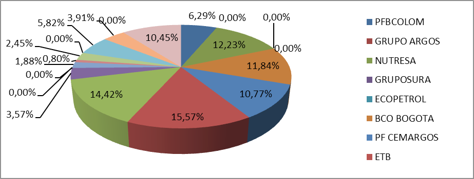 Una vez solucionada el problema cuadrático paramétrico, con la utilización de herramientas matemáticas, (puede ser programación automatizada), se obtiene la combinación óptima con pesos específicos para cada acción dentro de la composición del Colcap, comprensiblemente, el programa garantiza que se cumplan las restricciones propias del modelo. (Galvez et al, 2010). Es decir, se encuentra el portafolio óptimo de la canasta de acciones que hacen parte del índice Colcap, este procedimiento, se le agrega, una restricción adicional planteada con el fin de que los activos seleccionados no tuvieran una participación mayor al 20% tal como lo establece la política del índice Colcap, para que la proporción otorgada a cada activo sea mayor o igual a 0, generando de esta manera números positivos, tal como se muestra en el siguiente gráfica 1: