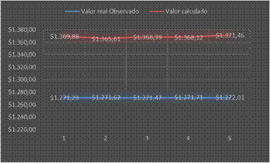 El efecto detallado del Colcap calculado y el observado, se muestra en el grafico 2, el cual permite deducir: en primer lugar, las distancias entre lo realmente observado y los valores calculados, arrojando una desviación promedio porcentual significativamente baja para cada día; sobre todo, si trata de una cartera réplica calculada con métodos estocásticos. En segundo lugar, ilustra la tendencia del Colcap observado, que se refleja casi como un espejo en el Colcap calculado siguiendo similares ritmos en su comportamiento, siendo el segundo día el de menor dispersión.