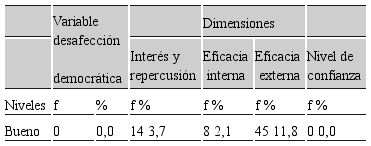 Los resultados estadísticos relación a la variable desafección democrática hicieron referencia a un 100% de nivel regular; en la dimensión interés y repercusión referenciaron que era 3,7% de nivel bueno y 96,3% nivel regular; en la dimensión eficacia interna referenciaron que era 2,1% de nivel bueno. 94,7% nivel regular y 3,2% de nivel malo; en la dimensión eficacia externa referenciaron que era 11,8% de nivel bueno y 88,2% nivel regular; en la dimensión nivel de confianza referenciaron que era 90.0%% de nivel regular y 10,0% nivel malo (Tabla 2, gráfico 2).