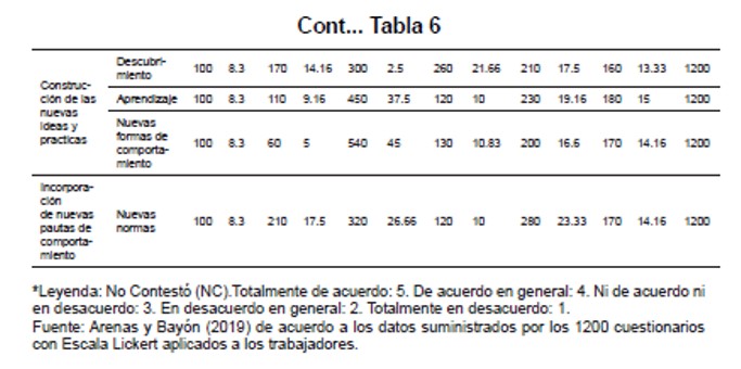 Arenas y Bayón (2019) de acuerdo a los datos suministrados por los 1200 cuestionarios con Escala Lickert aplicados a los trabajadores.Las competencias para el cambio que en la gestión del talento humano se debe considerar una característica subyacente en un individuo que está causalmente relacionada a un estándar de efectividad. Muchos empleados no creen que se lleven a cabo dichas modificaciones, en la Tabla 6 vemos que muchos pueden no creer que ocurran las acciones necesarias para desarrollar el cambio.