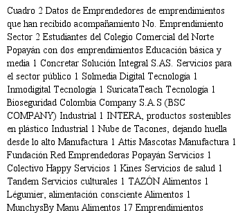 En el Cuadro 2 se muestran los a diferentes sectores económicos, 17 emprendimientos pertenecientes además de diferentes contextos en los que se devuelven.