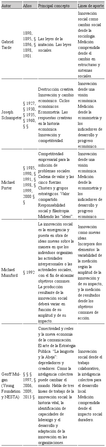 Se resalta también, de acuerdo con otro estudio realizado por Parada, Ganga y Rivera (2017;14), que en los últimos años se da la mayor revolución de la innovación social en cuanto a aplicación y reflexiones práctica, basadas en fuentes más o menos similares: Comisión Europea (1996, 2010, 2011), Manual de Oslo (2005), Libro Verde (1996), el Centro de Investigaciones para la Innovación Social - CRISES (Centre de Recherches Sur les Innovations Sociales, 2007), CEPAL (2008), NESTA (Global Innovation Foundation, con sede en UK, 2012), y, en Colombia, CIS (Departamento Nacional de Planeación (DNP), Departamento Administrativo de Ciencia, Tecnología e Innovación (Colciencias) y Centro de Innovación Social de la ANSPE, 2013).