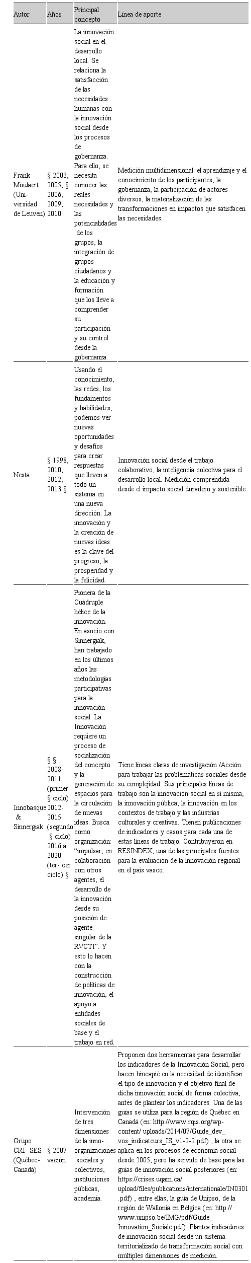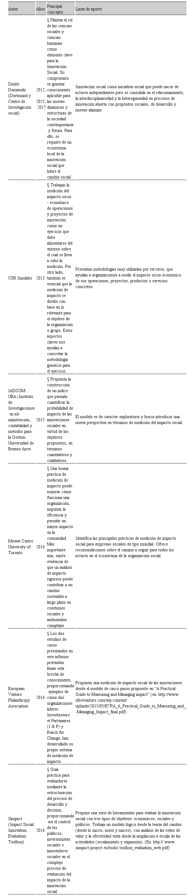A short guide to the research for Policy Makers, de Schmitz y otros (2013); los parámetros de TEPSIE –Theoretical, empirical and Policy Foundation for building Social Innovation in Europe, de la Comisión Europea (2013); la guía RESINDEX – Regional Social Innovation Index: A regional Index to Mesure Social Innovation, de Innobasque y Sinnergiak (2013); L’innovation sociale en pratiques solidaires. Émergence, approaches, caractérisation, definition, évaluation, Besançon y otros (2013); Strengthening social innovation in Europe: Journey to effective assessment and metrics, de la Comisión Europea (2012); L’Innovation Social: Un levier pour le développement des Territoires. Rèperes et bonnes pratiques pour développer des politiques régionales de soutien à l’innovation, de la Asociación
