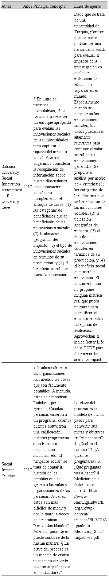 Los anteriores resultados muestran un giro de interés en las publicaciones sobre innovación social: de las conceptualizaciones y definiciones, al proceso de aplicación y medición frente a experiencias concretas que evidencien qué es y qué beneficios tienen las iniciativas y proyectos de innovación social en contextos locales, regionales y globales. Adicionalmente, da una serie de orientaciones frente a los modelos que se pueden (y deben) tener en cuenta para una medición contextualizada de la innovación social.