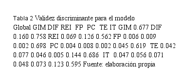 Para verificar la validez discriminante de las escalas de medición, se realizó la prueba del índice de varianza media extraída (IVE), el cual consiste en calcular el cuadrado de la correlación entre cada par de factores, el resultado de dicho cálculo se compara con las IVEs. Se puede afirmar la validez discriminante cuando los indicadores del IVE presentados en su diagonal principal, son mayores que los indicadores que están por debajo de la diagonal (Fornell y Larcker, 1981). Como puede apreciarse en la Tabla 2 las IVEs presentadas cumplen con dicha condición, demostrando validez discriminante.