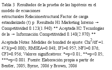 Posterior a verificar el ajuste del modelo estructural, se procedió a la comprobación de las hipótesis planteadas, de acuerdo con los resultados la hipótesis 1 en la que planteó en el modelo que marketing interno influye positiva y significativamente en la competitividad, los resultados señalan que la carga factorial estandarizada fue de 0.123 con un valor t= 1.940, esto indica una relación positiva y significativa al 0.05 (**), por lo que se acepta la primera hipótesis (Tabla 3).