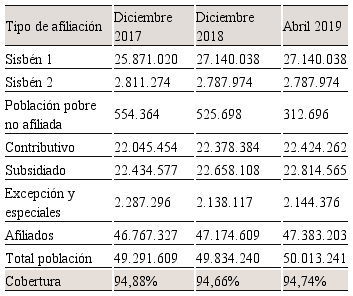 Ministerio de Salud (2019). Cifras de aseguramiento en salud. Bogotá. https://www.minsalud.gov.co/ proteccionsocial/Paginas/cifrasaseguramiento-salud.aspx