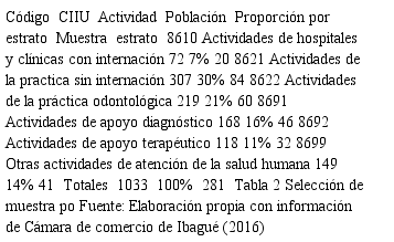 Según el Código Industrial Internacional Uniforme CIIU, los servicios de salud incluyen hospitales, clínicas, centros médicos, odontológicos, diagnósticos, terapéuticos y entidades donde se realizan otras actividades de atención de la salud. El estudio es de enfoque cuantitativo y de alcance descriptivo, por cuanto permitió conocer, en la fuente primaria, el comportamiento de las variables identificadas; la unidad de análisis es el sector salud de Ibagué – Colombia; para el análisis del sector, se toma como población objeto de estudio 1033 empresas, según la información suministrada por la Cámara de Comercio de Ibagué (2016). Para la determinación de la muestra, se consideró un nivel de confianza del 95%, y un error de 5% obteniéndose una muestra poblacional de 281 empresas. Teniendo en cuenta