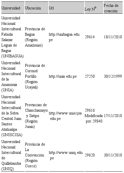 Frente a esta situación, las universidades interculturales surgen como una alternativa para la población amazónica del Perú y, a diferencia de otros países, no necesariamente están enfocadas a otros pueblos como los quechuas, aimaras o afrodescendientes. Sin embargo, es preciso señalar que, según los lineamientos del Minedu, las universidades interculturales puedan estar abiertas a la presencia de otros grupos socioculturales (PUCP, 2018).