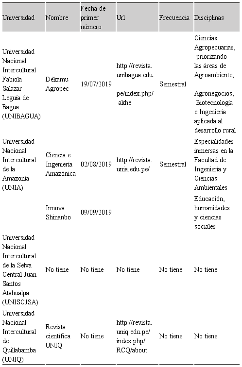El análisis de las revistas científicas de las universidades nacionales interculturales peruanas, se realizó durante el mes de julio de 2020.
