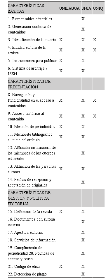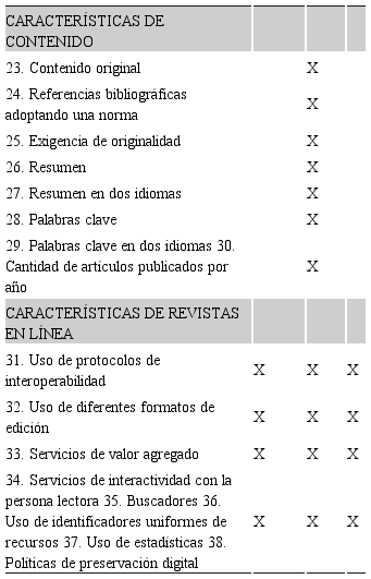 La metodología de Latindex, considera un total de 38 características, que se muestan a continuación en el cuadro 3.