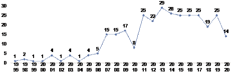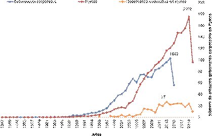 en la selección de artículos para ésta revisión, se limitó esta búsqueda a las áreas temáticas relacionadas con el objeto de este estudio (ver criterio de selección 2 de la Tabla 3). Así entonces, se obtienen 22.379 documentos de gobernanza corporativa, 33.588 estudios orientados a pequeñas y medianas empresas y 288 investigaciones que relacionan la gobernanza corporativa en pequeñas y medianas empresas; es decir, una relación entre ambas categorias; la gráfica siguiente muestra el comportamiento de los resultados de búsqueda encontrados a partir del año 1947 hasta el primer semestre de 2020, gráfico 2: